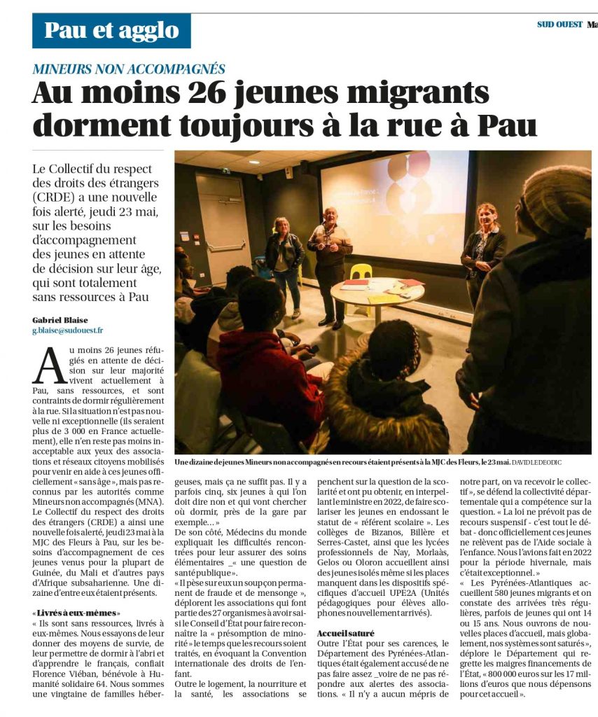 Notre conférence de presse du jeudi 23 mai à la MJC des Fleurs « MNA en recours à Pau : Faisons le point sur la situation actuelle et nos revendications » a eu des retombées médiatiques et quelques réactions des institutions publiques. Nos revendications Nos revendications vis-à-vis du CD 64 Nos revendications vis-à-vis de la DDETS Nos revendications vis-à-vis des Parlementaires